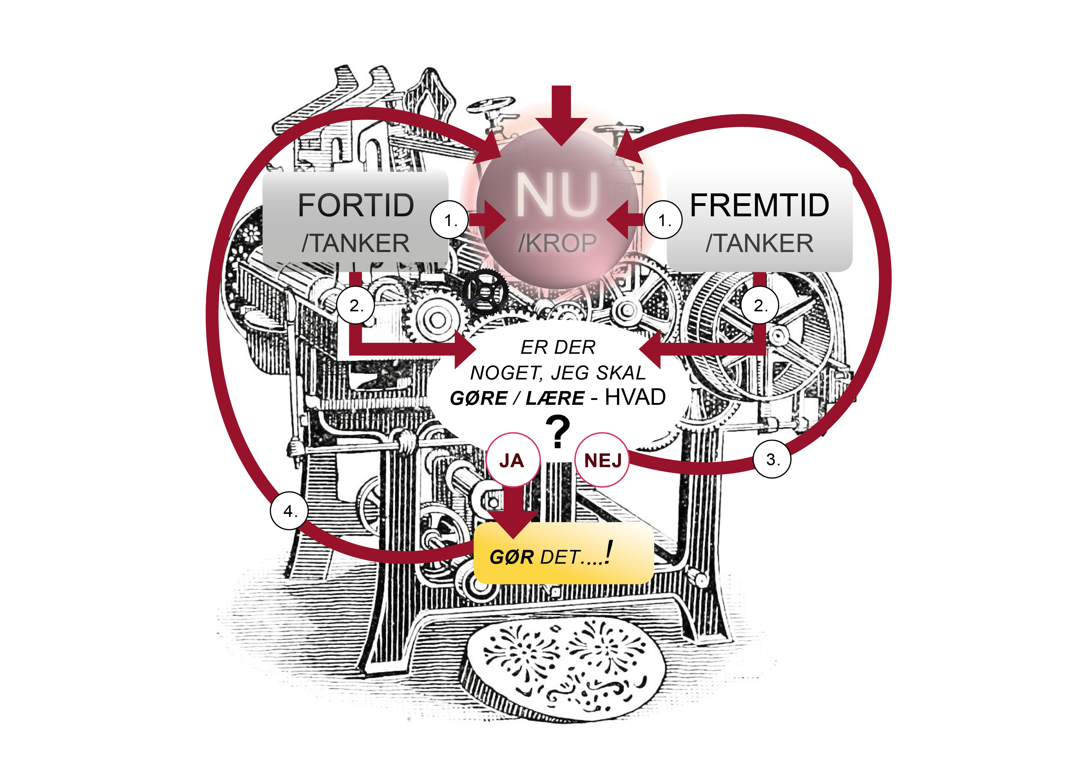 Hver gang, du fanger dig selv med tankerne kørende i fortid eller fremtid: Start maskinen! Hen ad vejen bliver det stadigt lettere og mere og mere naturligt.